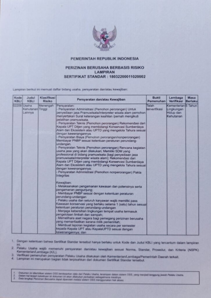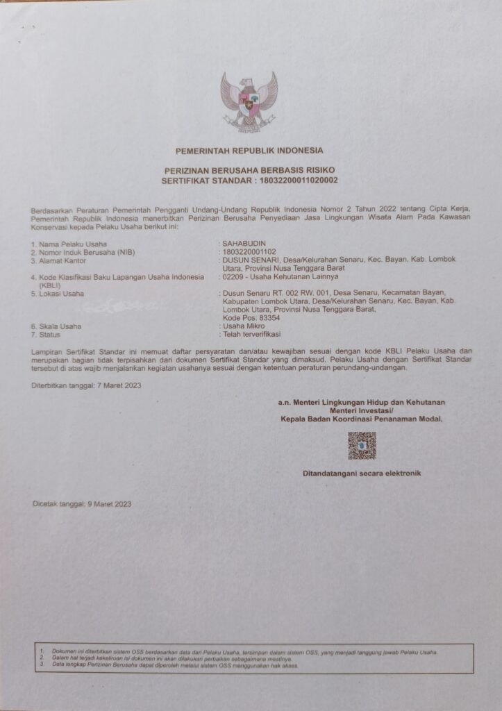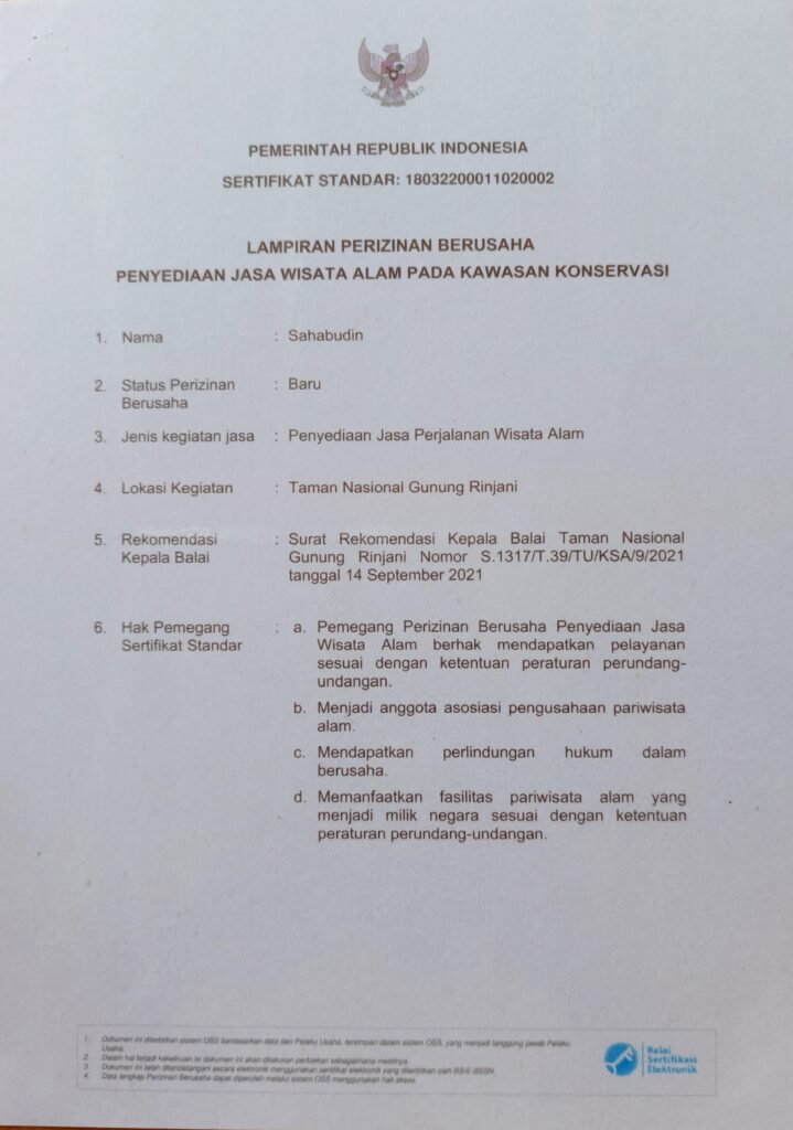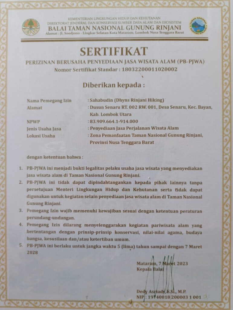 Our trekking service operates with official permits from the government and the Mount Rinjani National Park authority. This authorization ensures that all our trekking activities follow the official regulations, safety standards, and environmental protection rules set by